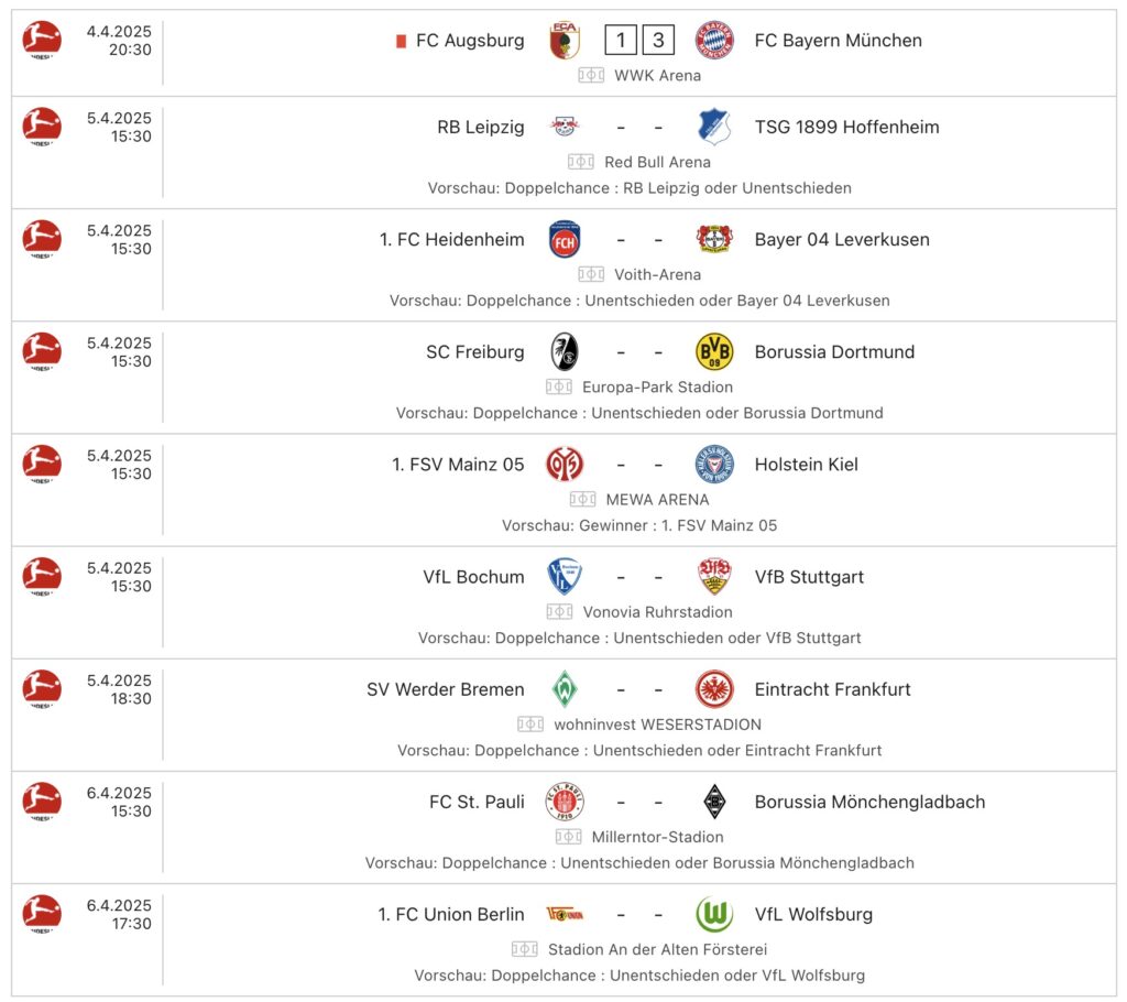 Der heute beginnende 28. Spieltag der Bundesliga-Saison 2024/2025 verspricht tolle Spiele für Fußballbegeisterte. Am Freitagabend startete der Spieltag mit einem spannenden Bayernderby, welches der FC Bayern München mit 3:1 für sich entschied. Überschattet war das Spiel von der Verletzung Jamal Musialas, der wohl die Champions League am Dienstag verpassen wird.