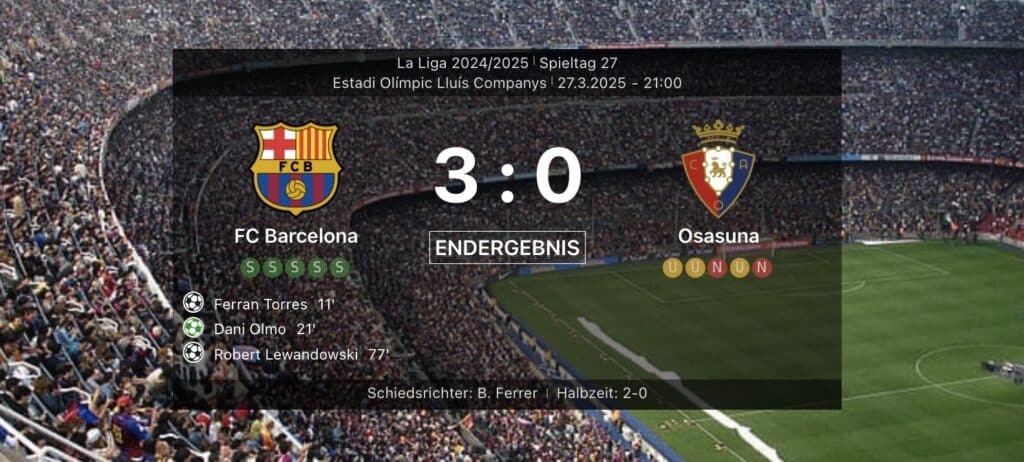 Der FC Barcelona bleibt in der La Liga trotz eines formellen Einspruchs von CA Osasuna unbeeindruckt. Nach dem klaren 3:0-Sieg gegen die Nordspanier richtet Trainer Hansi Flick den Blick bereits auf das kommende Spitzenspiel gegen Girona. Doch im Hintergrund sorgt ein Streit um die Spielberechtigung von Innenverteidiger Iñigo Martínez für Unruhe – Osasuna sieht einen Regelverstoß und will die Wertung kippen lassen. Dennoch hat der FC Barcelona auf Platz 2 “nur” 85 Punkte – 10 Punkte hinter Real Madrid.